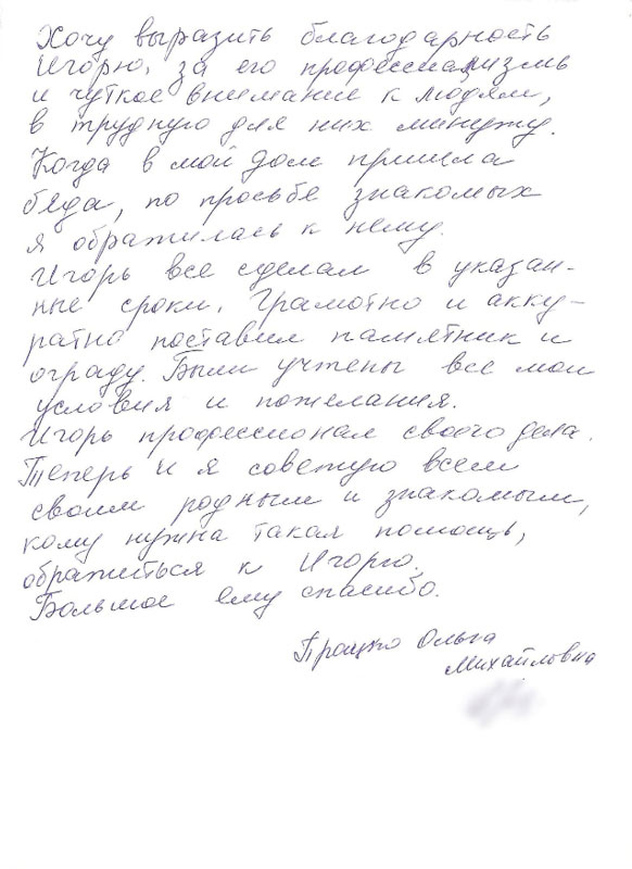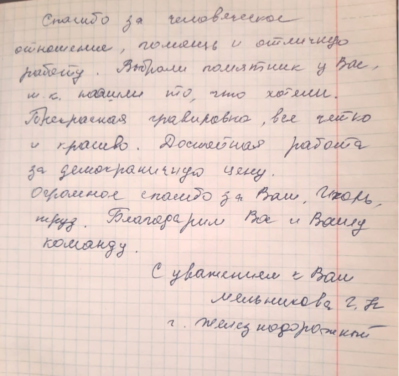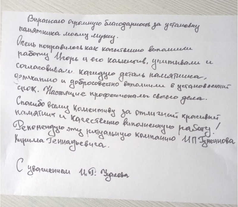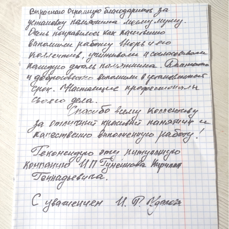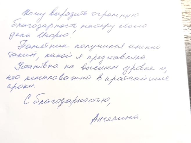 Мы понимаем, что потеря близкого человека - это тяжелый период в жизни каждого человека, и поэтому стараемся сделать все возможное, чтобы облегчить вам хотя бы часть дополнительных хлопот и забот. Мы берем на себя весь процесс изготовления и установки памятника, чтобы вы могли полностью сконцентрироваться на своем горе и переживаниях.
